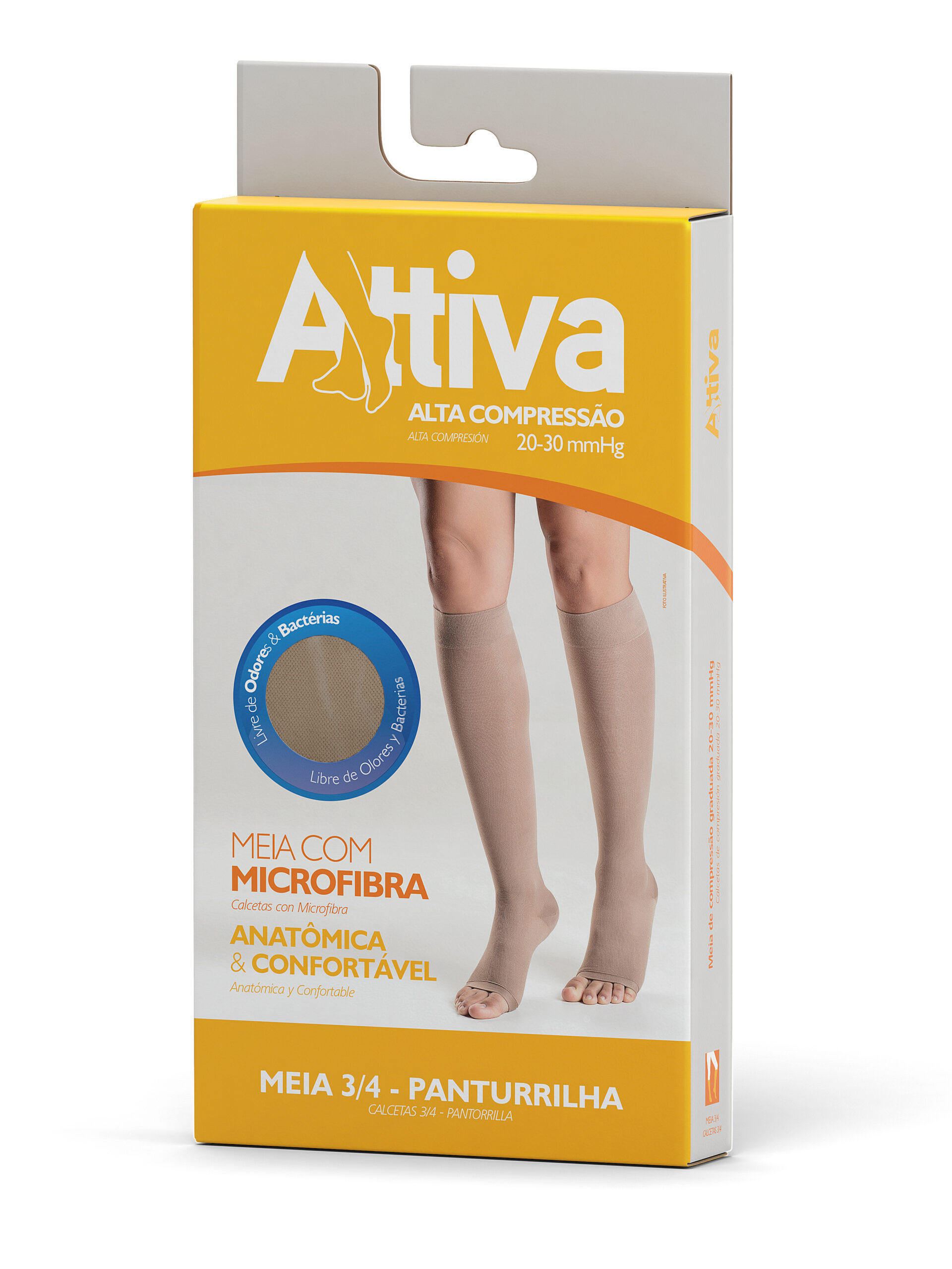 Linha 600 – ATTIVA (Antiga DYNAVEN) – 20-30 mmHg PANTURRILHA FEMININA PONTEIRA FECHADA, com fios de poliamida e elastano. Modelos Panturrilha e Meia-coxa, disponível nas cores Natural (nº36), Natural Escura (nº29) e Preta (nº99) para os modelos Femininos e Marrom (nº11) e Preta (nº99) para os modelos Masculinos, nos Tamanhos P, M, G e GG para a linha Feminina e P, M e G para a linha Masculina.